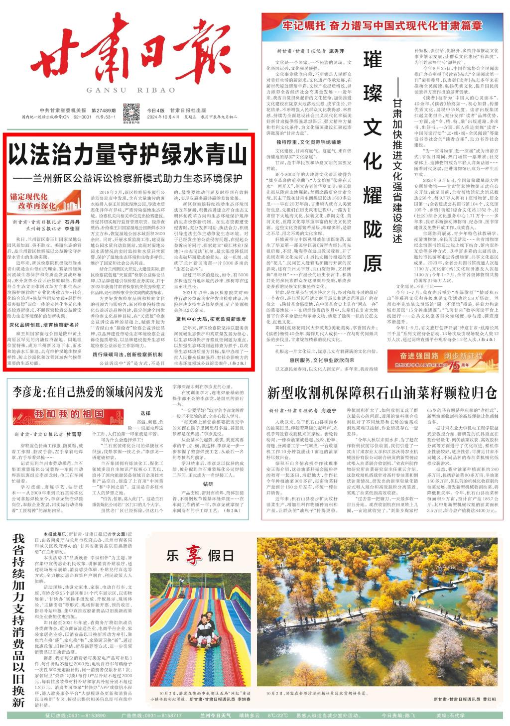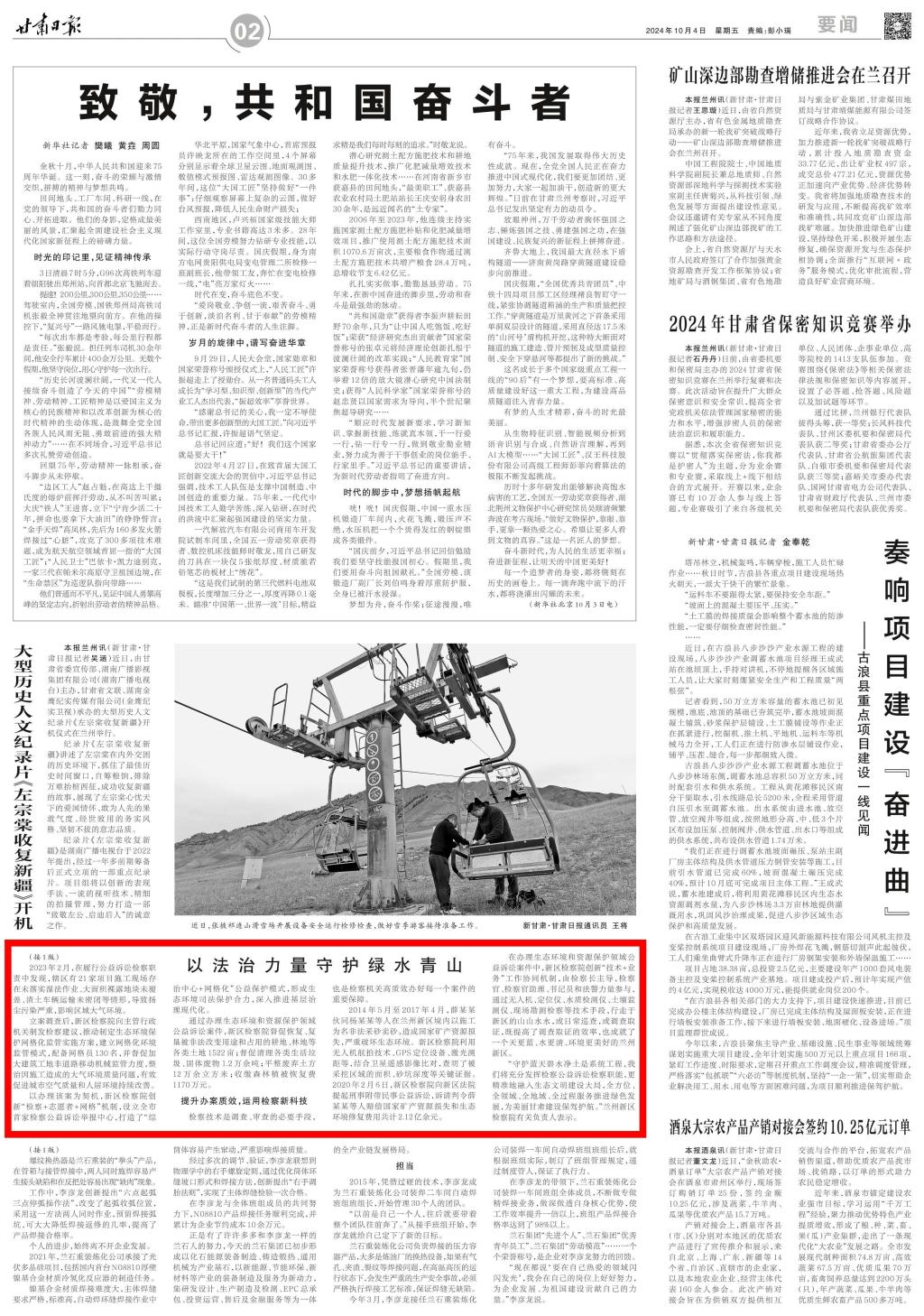 2024年10月4日,甘肃日报头版头条刊发《以法治力量守护绿水青山——兰州新区公益诉讼检察新模式助力生态环境保护》。