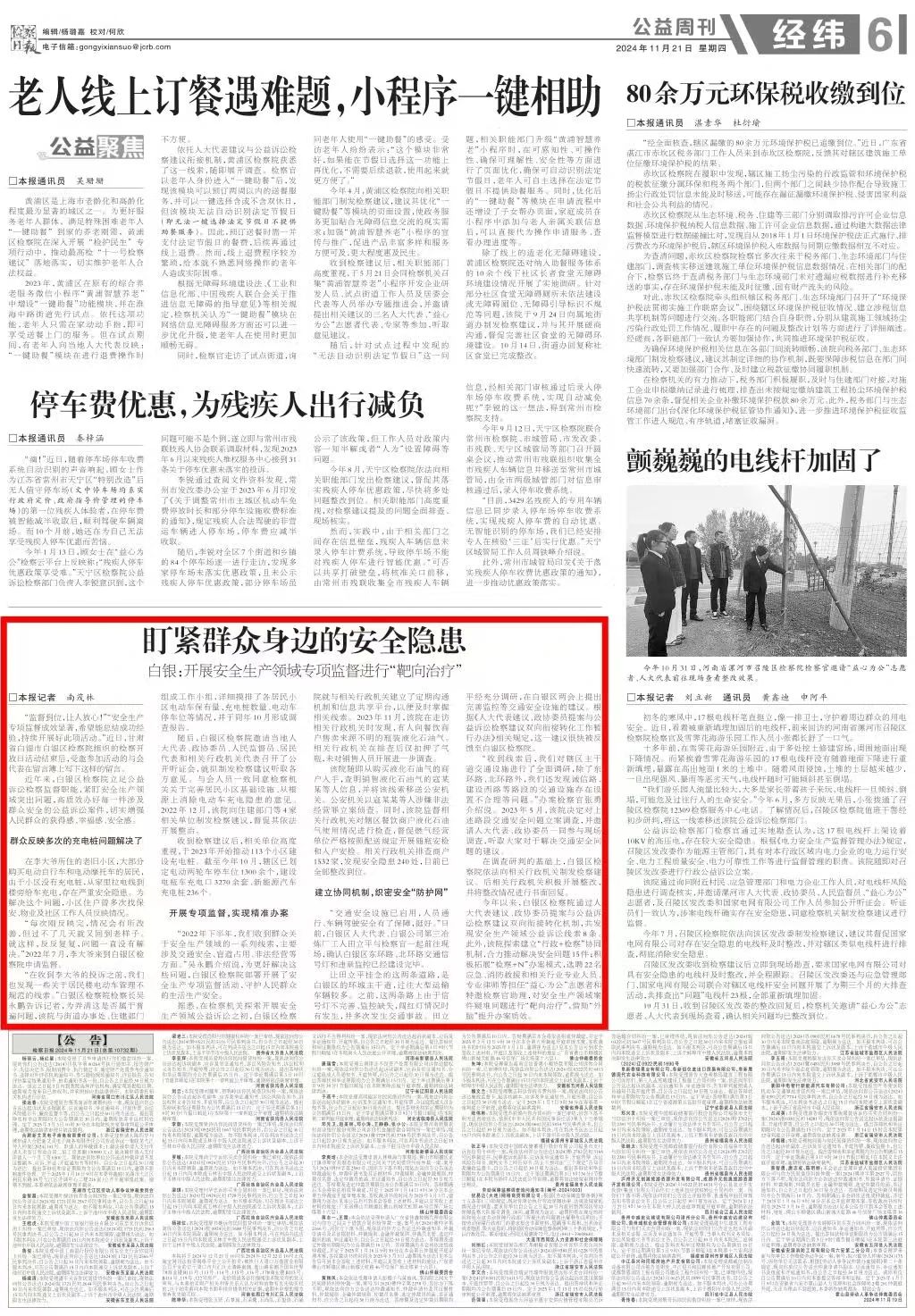 2024年11月21日,检察日报公益周刊刊发《盯紧群众身边的安全隐患——白银:开展安全生产领域专项监督进行“靶向治疗”》。