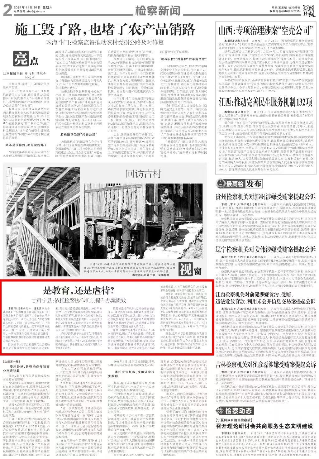 2024年11月30日,检察日报刊发《是教育,还是虐待?——甘肃宁县:依托检警协作机制提升办案质效》。