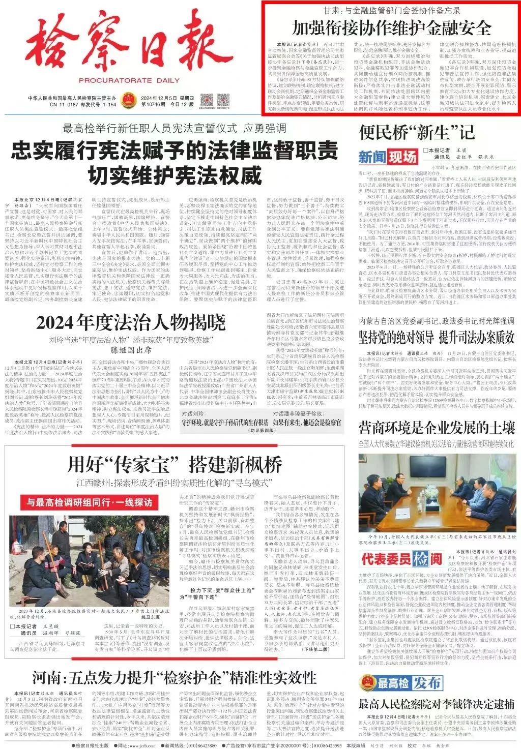 2024年12月5日,检察日报头版刊发《甘肃:与金融监管部门会签协作备忘录 加强衔接协作维护金融安全》。