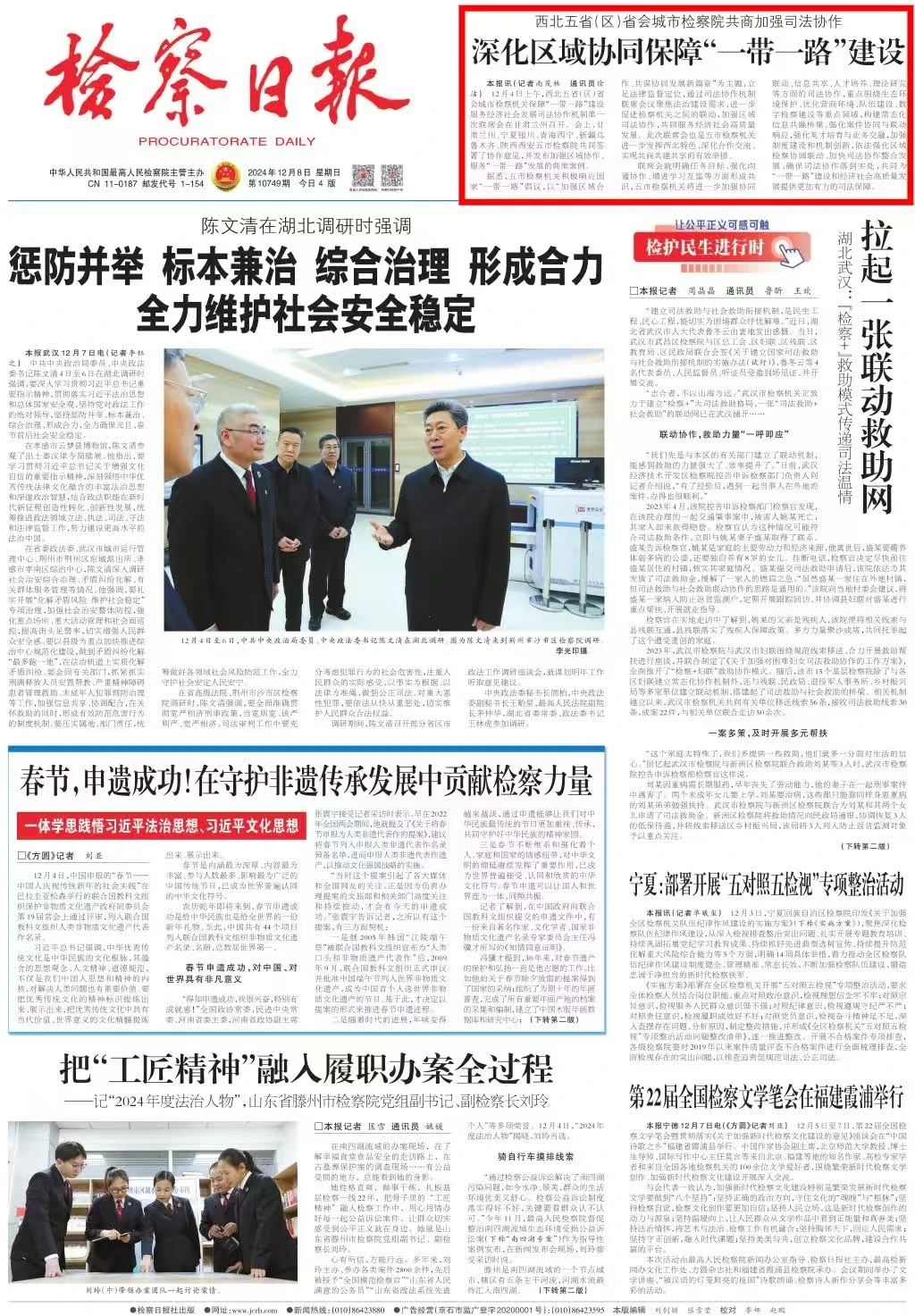 2024年12月8日,检察日报头版刊发《西北五省(区)省会城市司机社共商加强司法协作 深化区域协同保障“一带一路”建设》。