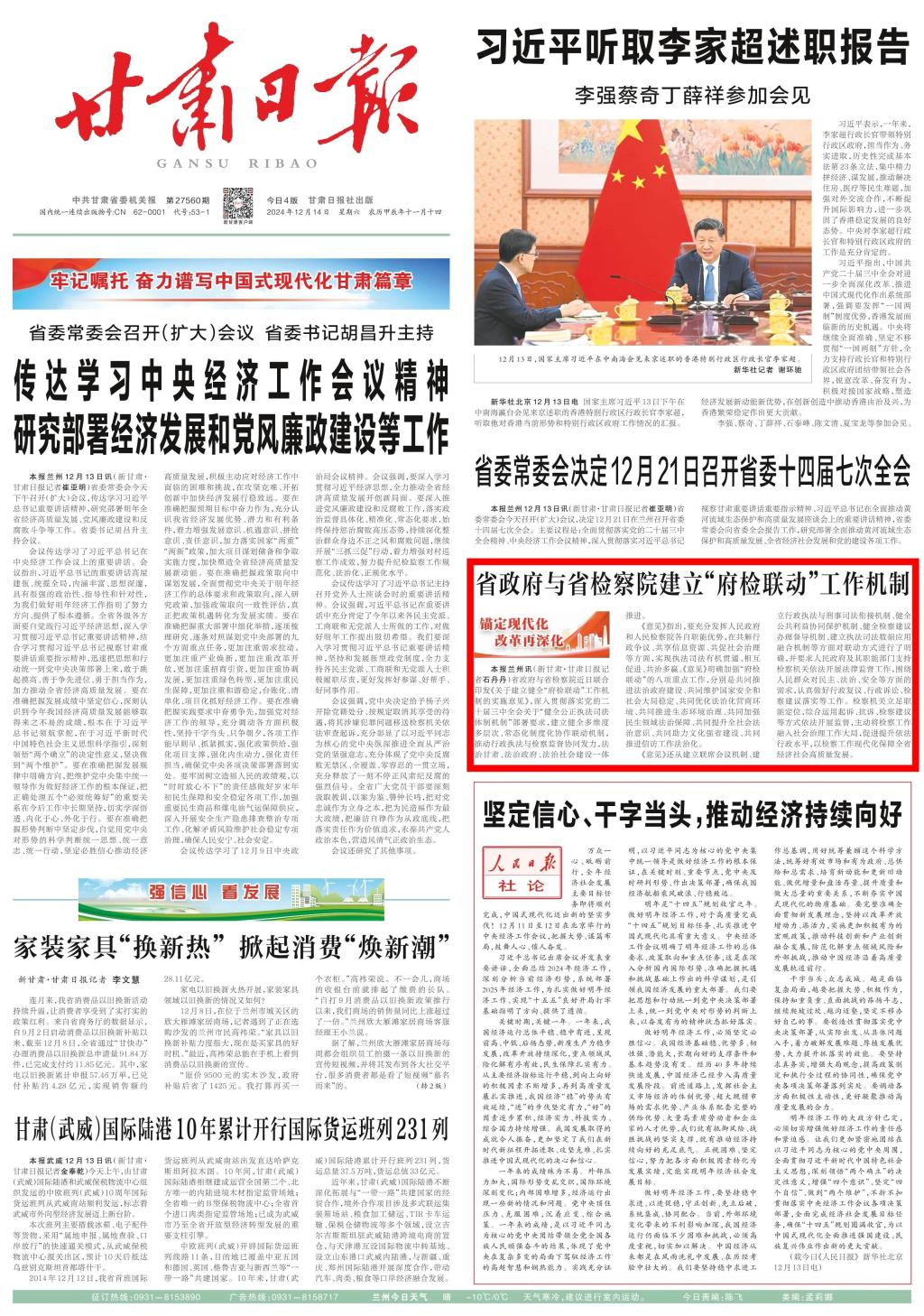 2024年12月14日,甘肃日报头版刊发《省政府与司机社