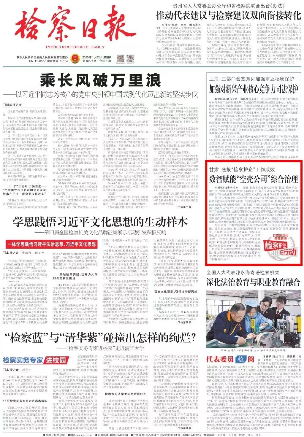 2025年1月2日,检察日报头版刊发《甘肃:通报“检察护企”工作成效——数智赋能“空壳公司”综合治理》。
