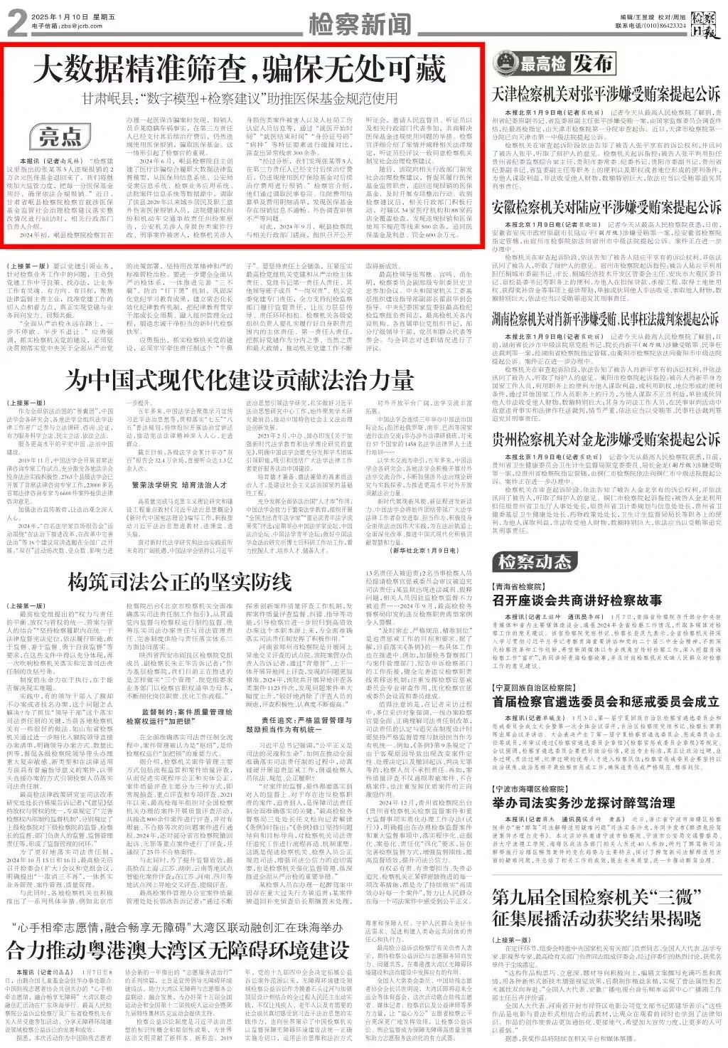 2025年1月10日,检察日报二版头条刊发《大数据精准筛查,骗保无处可藏——甘肃岷县:“数字模型+检察建议”助推医保基金规范使用》。