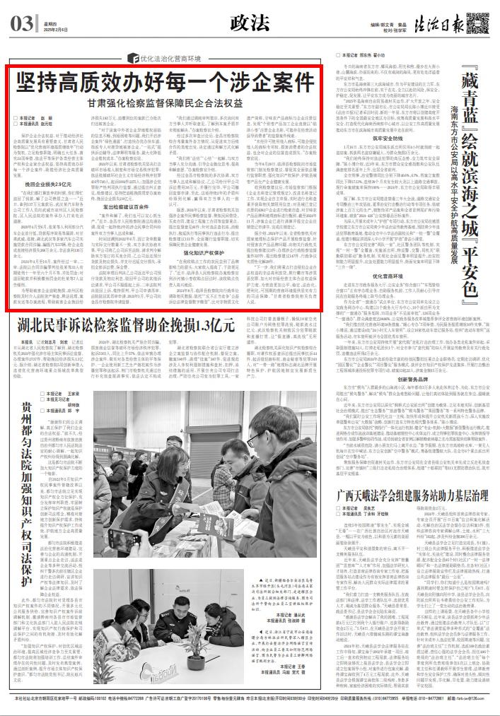 2025年2月6日,法治日报刊发《坚持高质效办好每一个涉企案件——甘肃强化检察监督保障民企合法权益》。