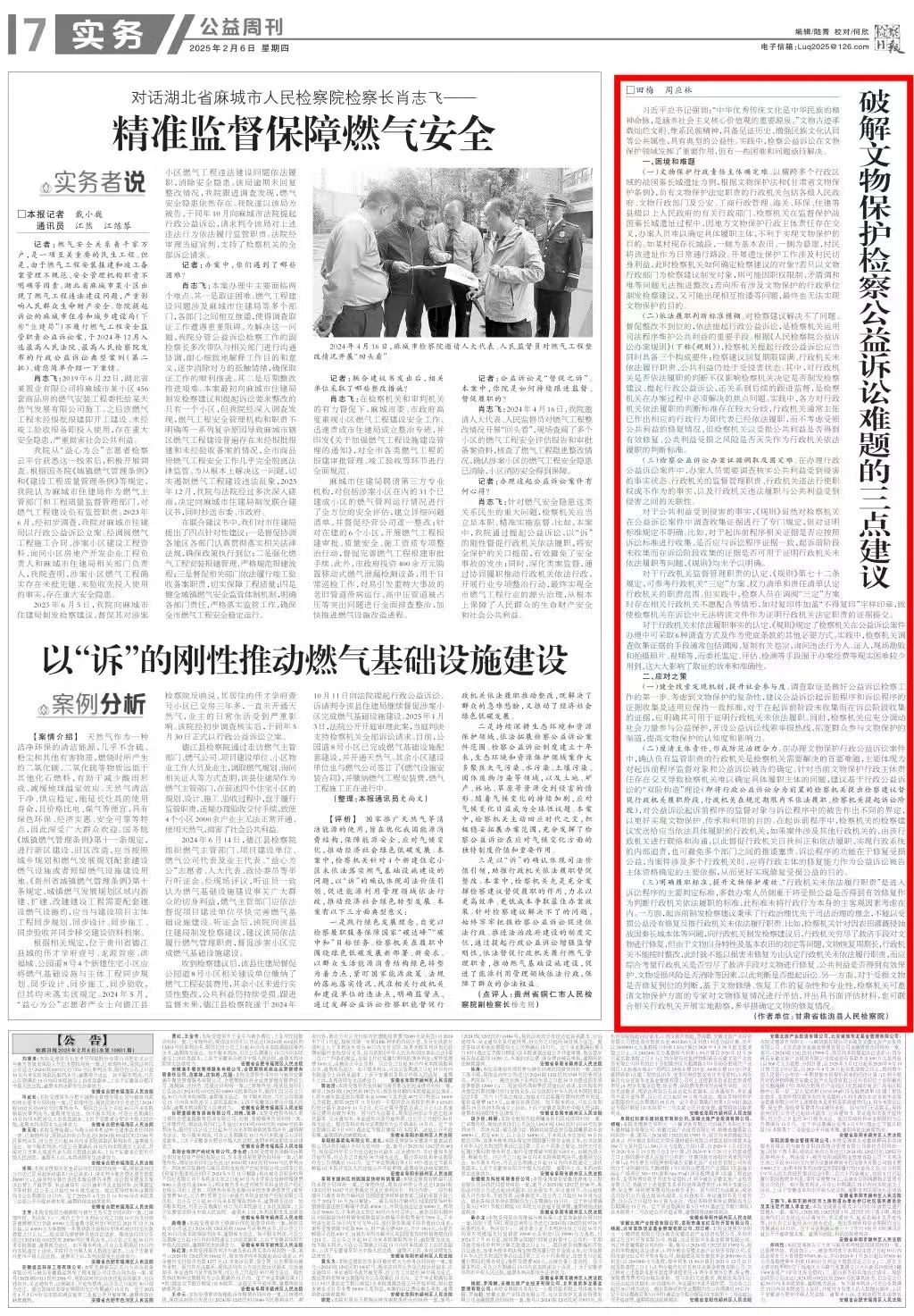 2025年2月6日,检察日报公益周刊刊发《破解文物保护检察公益诉讼难题的三点建议》。