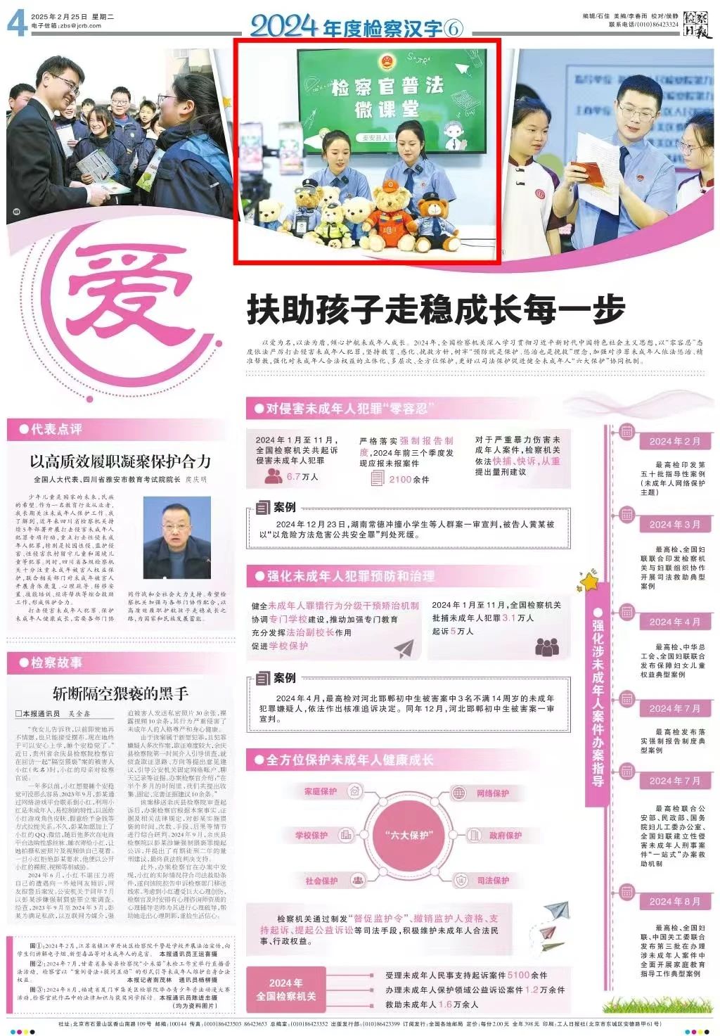 2025年2月25日,检察日报《2024年度检察汉字⑥》专版刊发新闻图片《甘肃省秦安县司机社“小禾苗”未检工作室举行直播普法活动》。