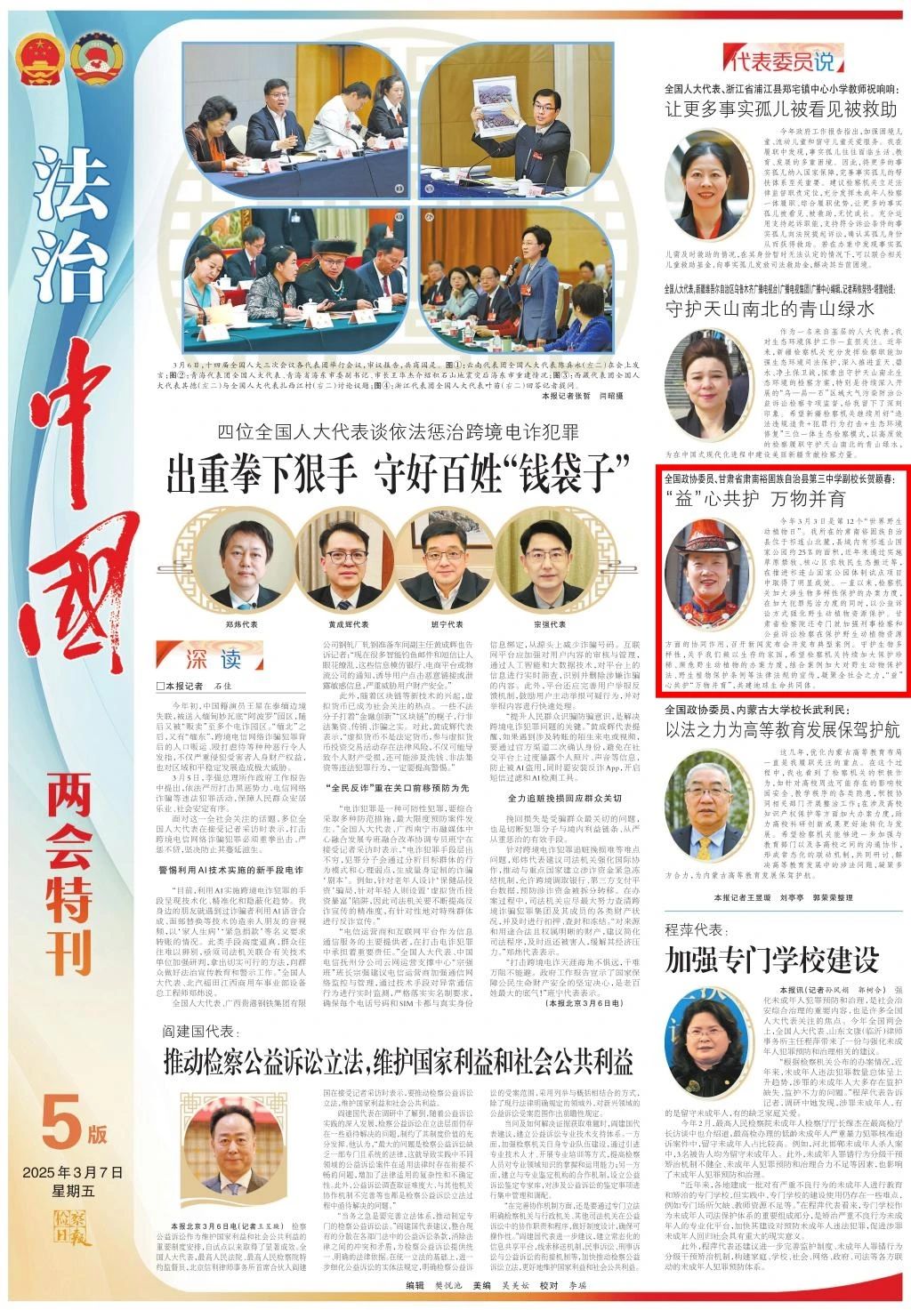 2025年3月7日,检察日报《法治中国两会特刊》专栏刊发《全国政协委员、甘肃省肃南裕固族自治县第三中学副校长贺颖春:“益”心共护 万物并育》。