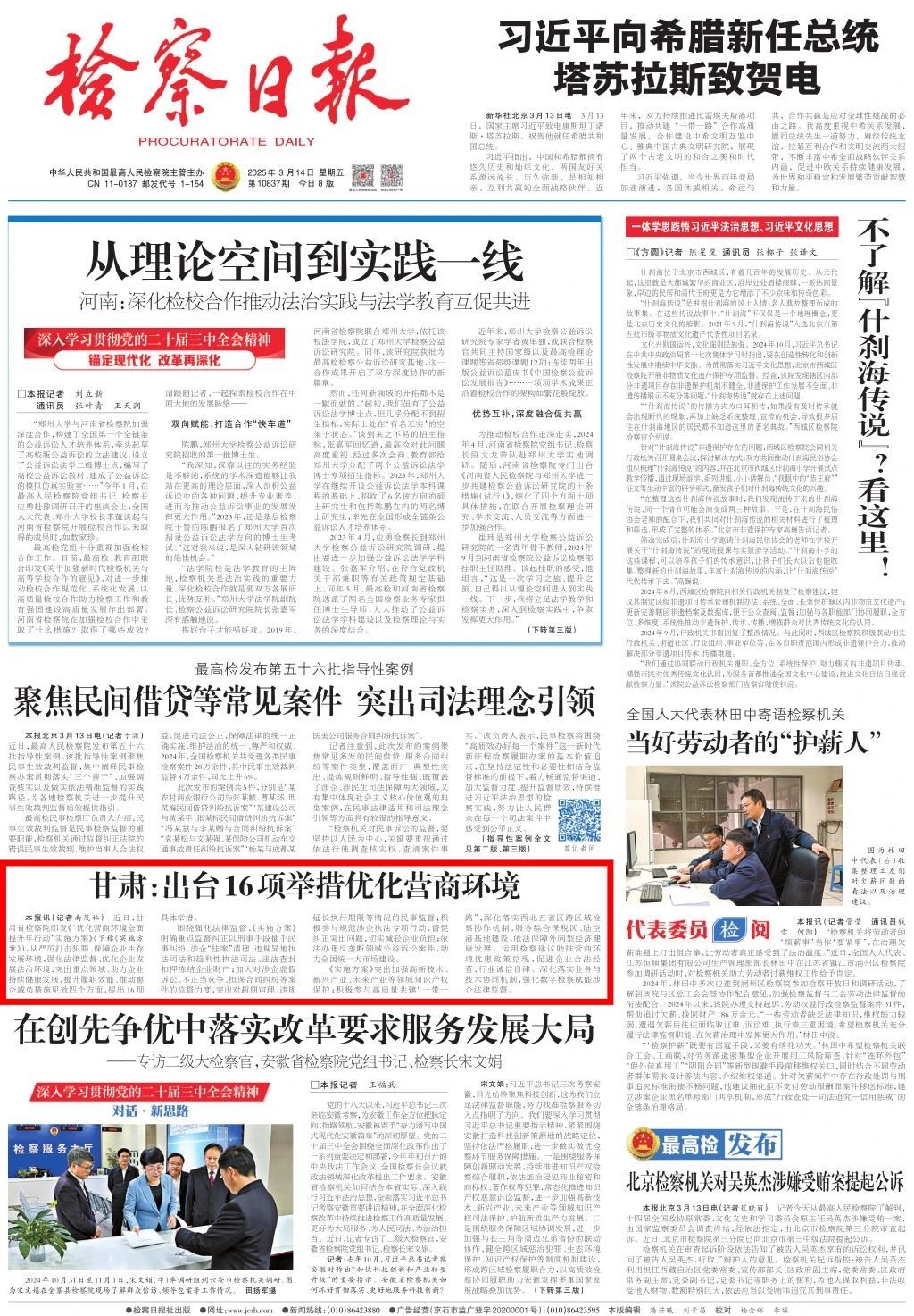 2025年3月14日,检察日报头版刊发《甘肃:出台16项举措优化营商环境》。