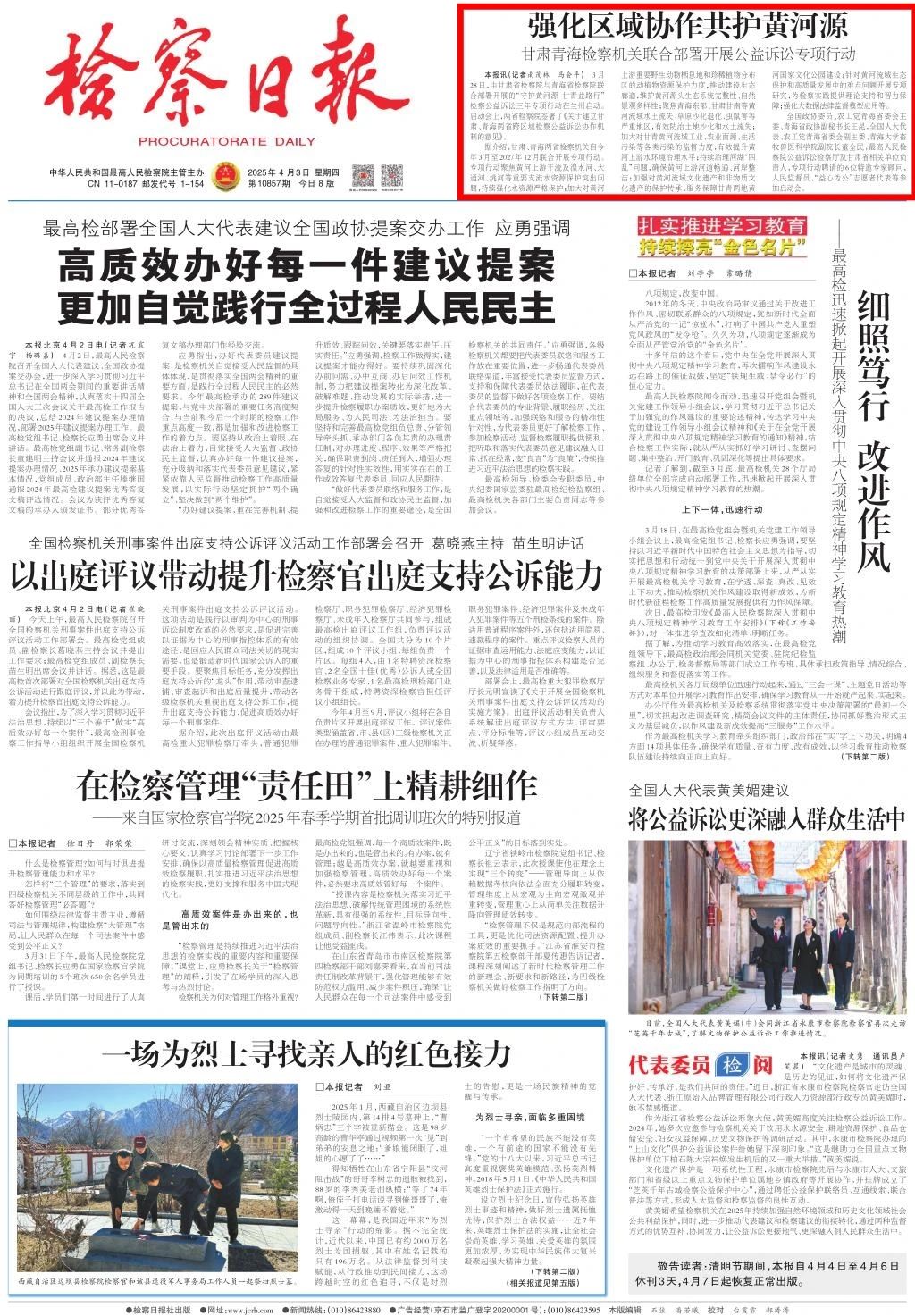 2025年4月3日,检察日报头版刊发《强化区域协作共护黄河源——甘肃青海检察机关联合部署开展公益诉讼专项行动》。