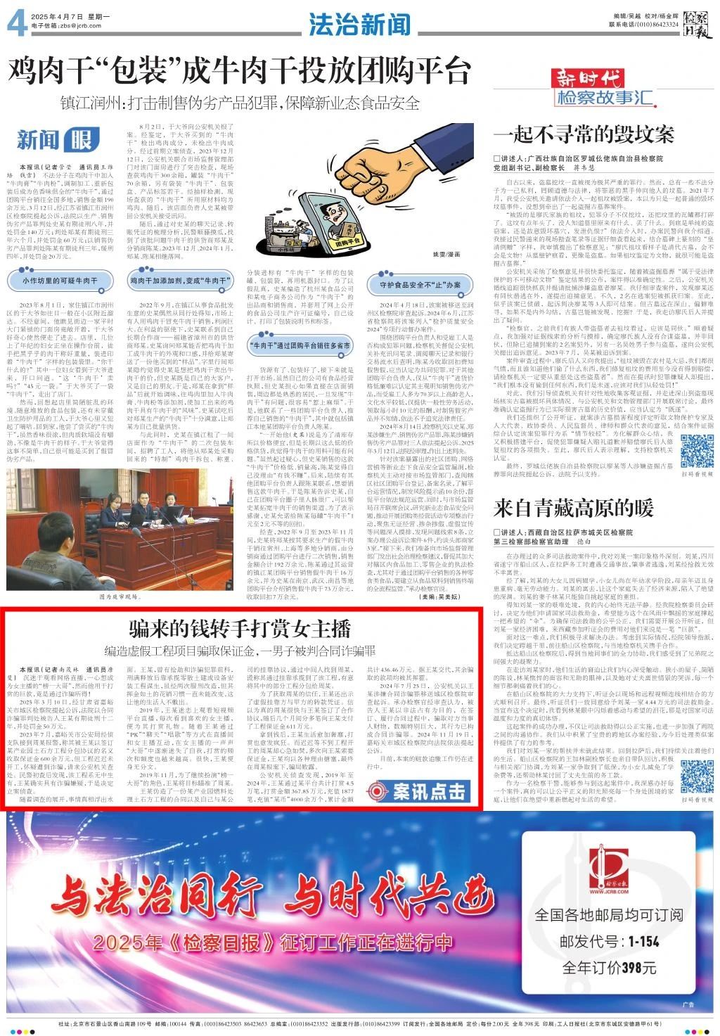 2025年4月7日,检察日报刊发《骗来的钱转手打赏女主播——编造虚假工程项目骗取保证金,一男子被判合同诈骗罪》。