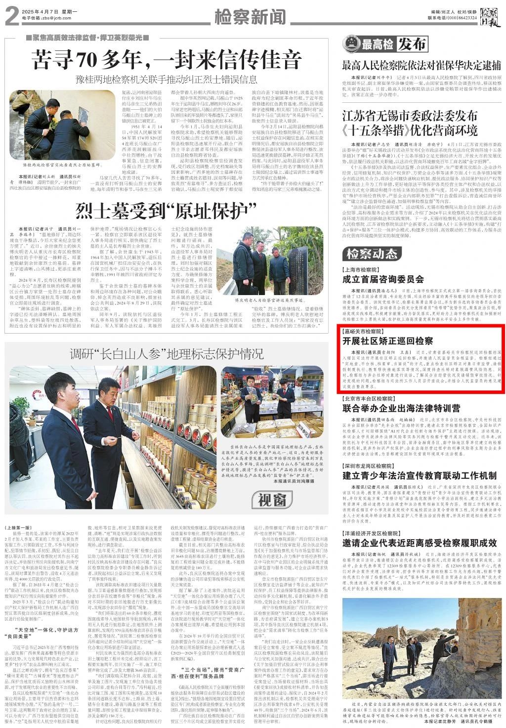 2025年4月7日,检察日报刊发《嘉峪关市司机社:开展社区矫正巡回检察》。