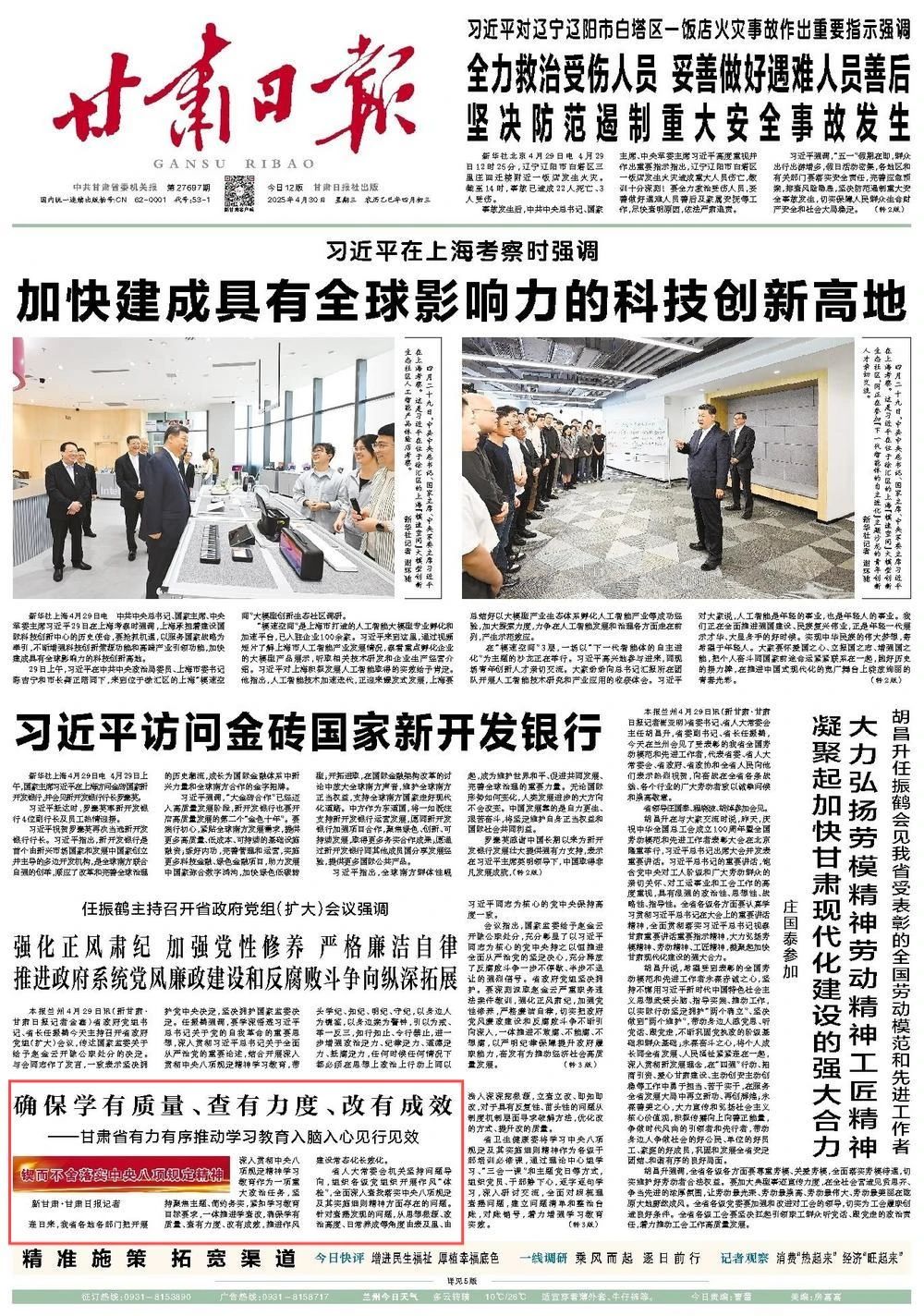 2025年4月30日,甘肃日报刊发《确保学有质量、查有力度、改有成效——甘肃省有力有序推动学习教育入脑入心见行见效》。