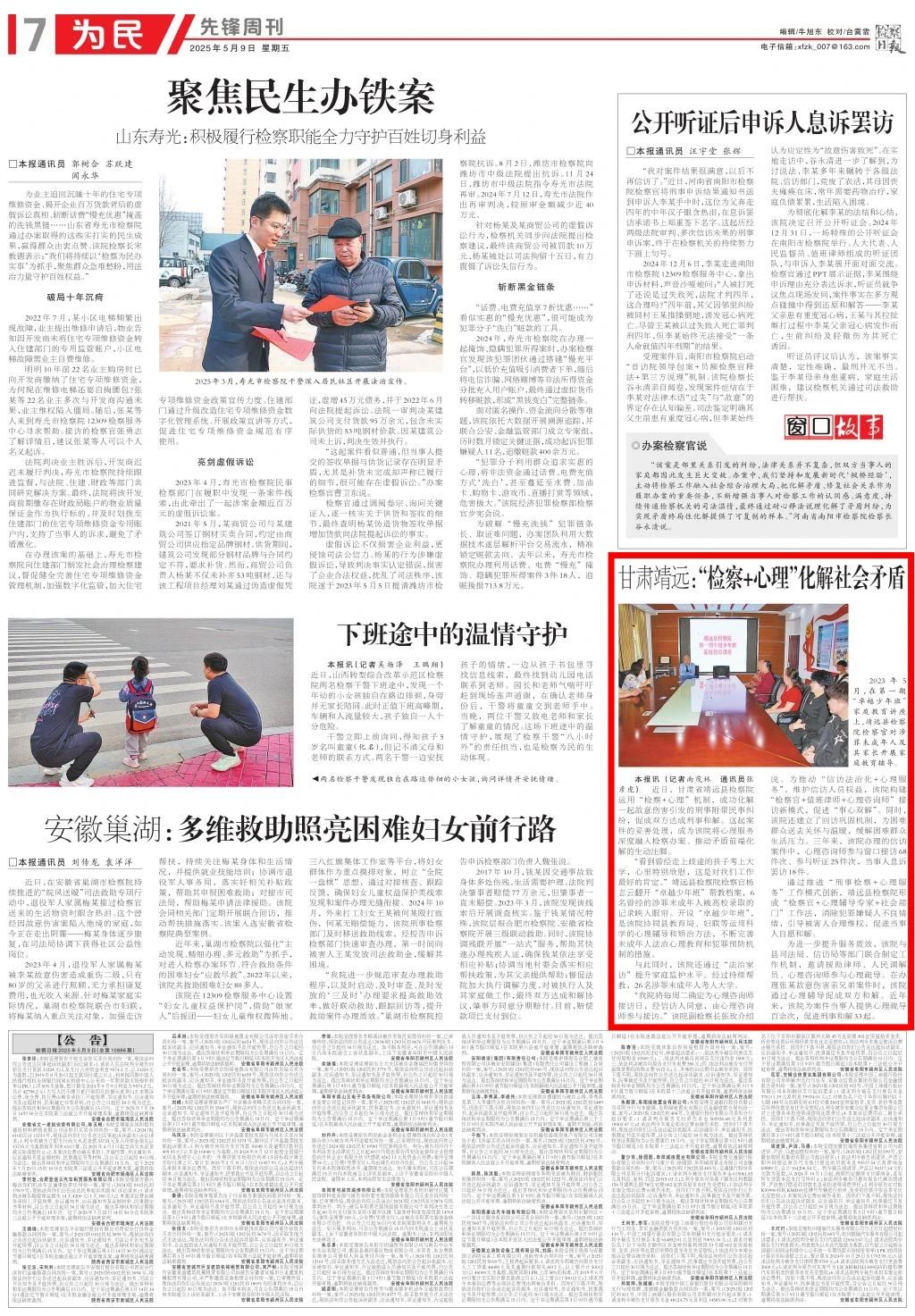2025年5月9日,检察日报先锋周刊刊发《甘肃靖远:“检察+心理”化解社会矛盾》。