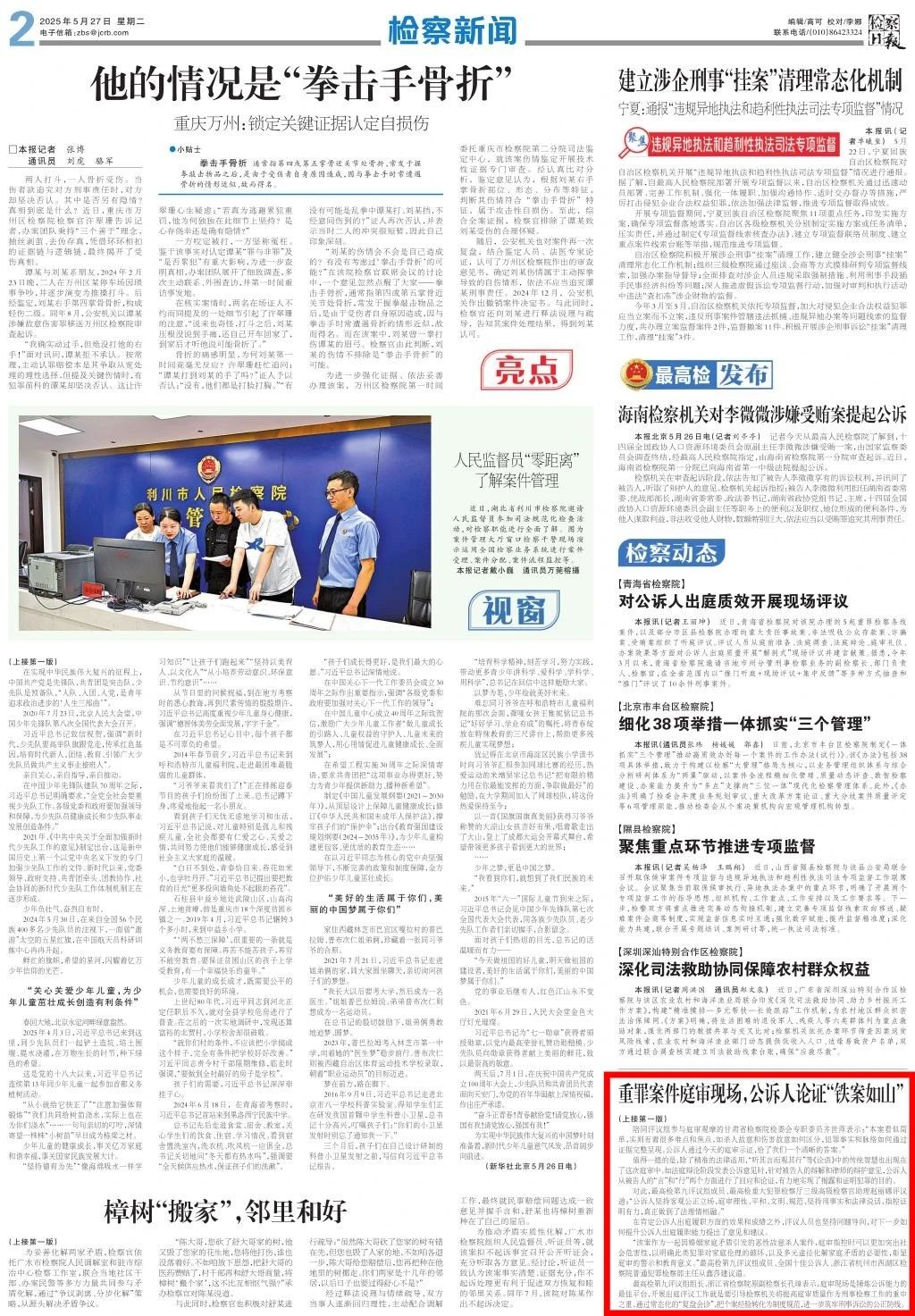 2025年5月27日,检察日报头版刊发《重罪案件庭审现场,公诉人论证“铁案如山”》。