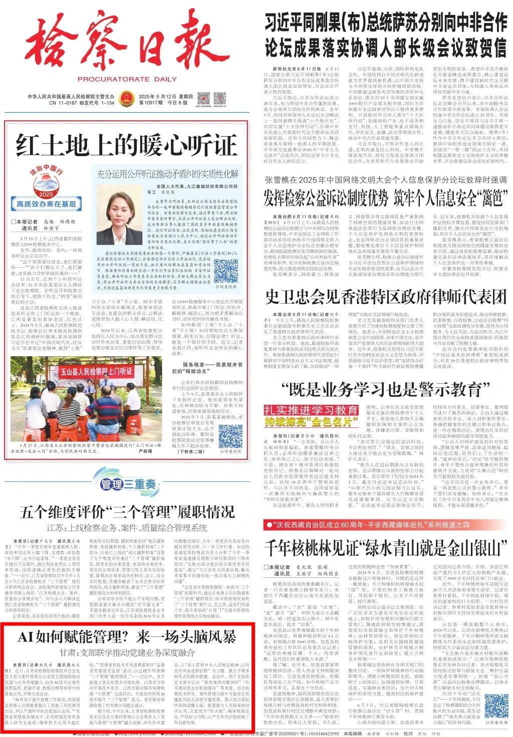 2025年6月12日,检察日报头版刊发《AI如何赋能管理?来一场头脑风暴 甘肃:支部联学推动党建业务深度融合》。