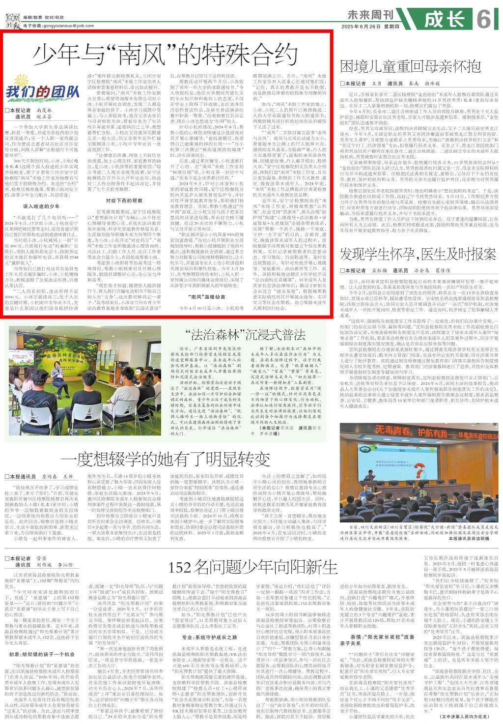 2025年6月26日,检察日报未来周刊刊发《少年与“南风”的特殊合约》。
