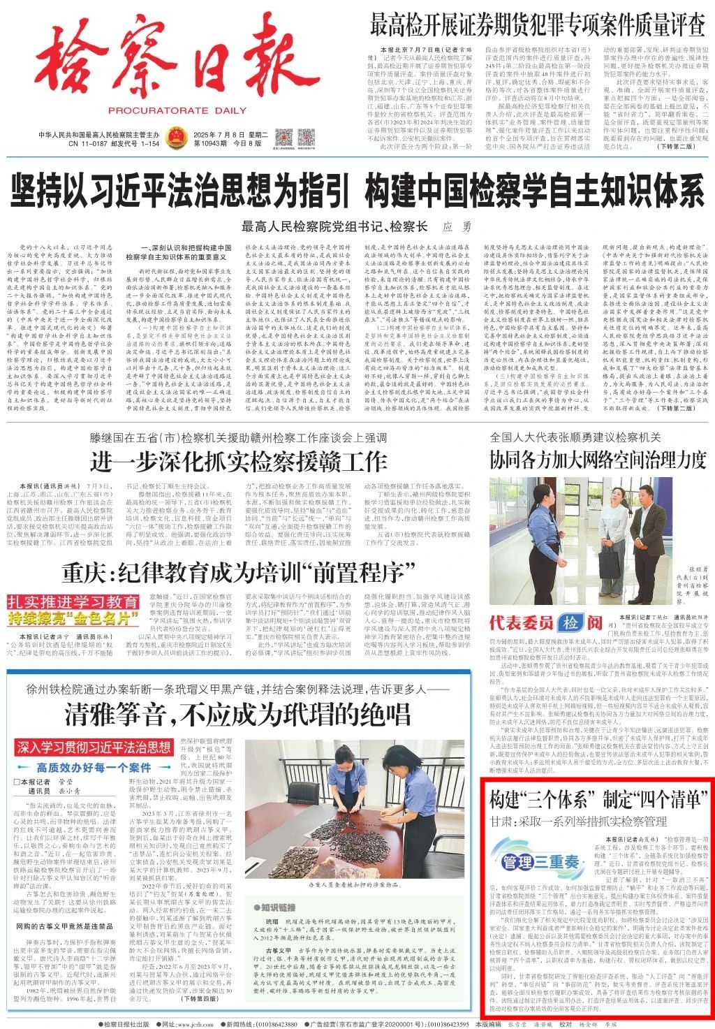 2025年7月8日,检察日报头版刊发《构建“三个体系” 制定“四个清单”——甘肃:采取一系列举措抓实检察管理》。