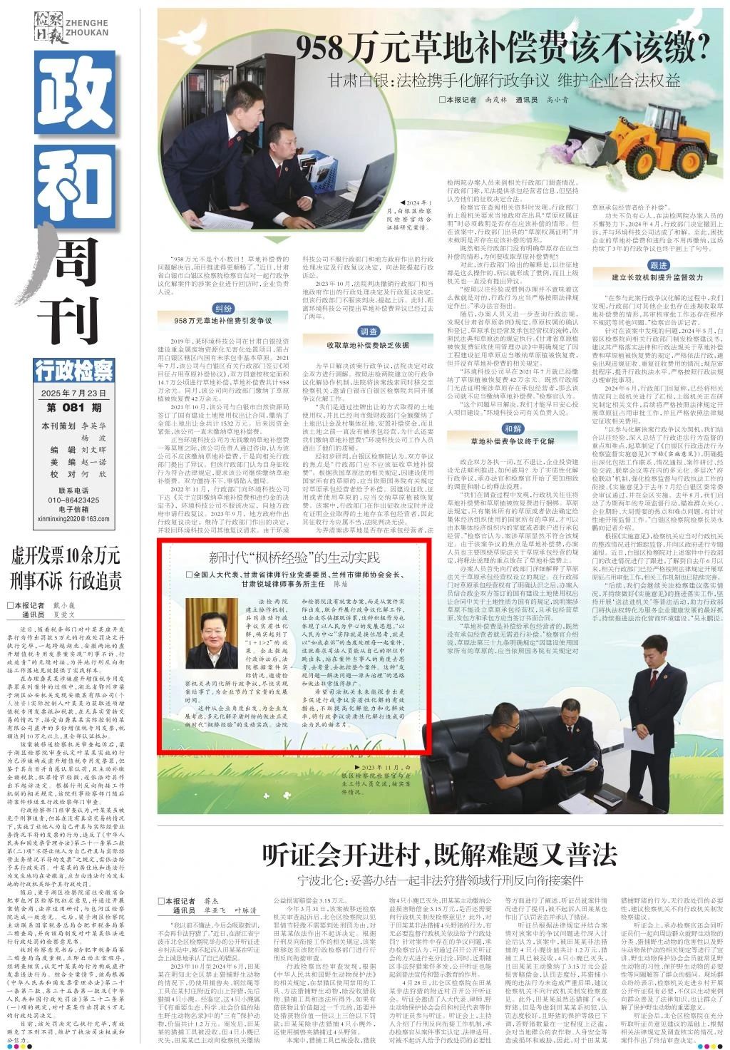 2025年7月23日,检察日报政和周刊刊发《全国人大代表陈灿:新时代“枫桥经验”的生动实践》。
