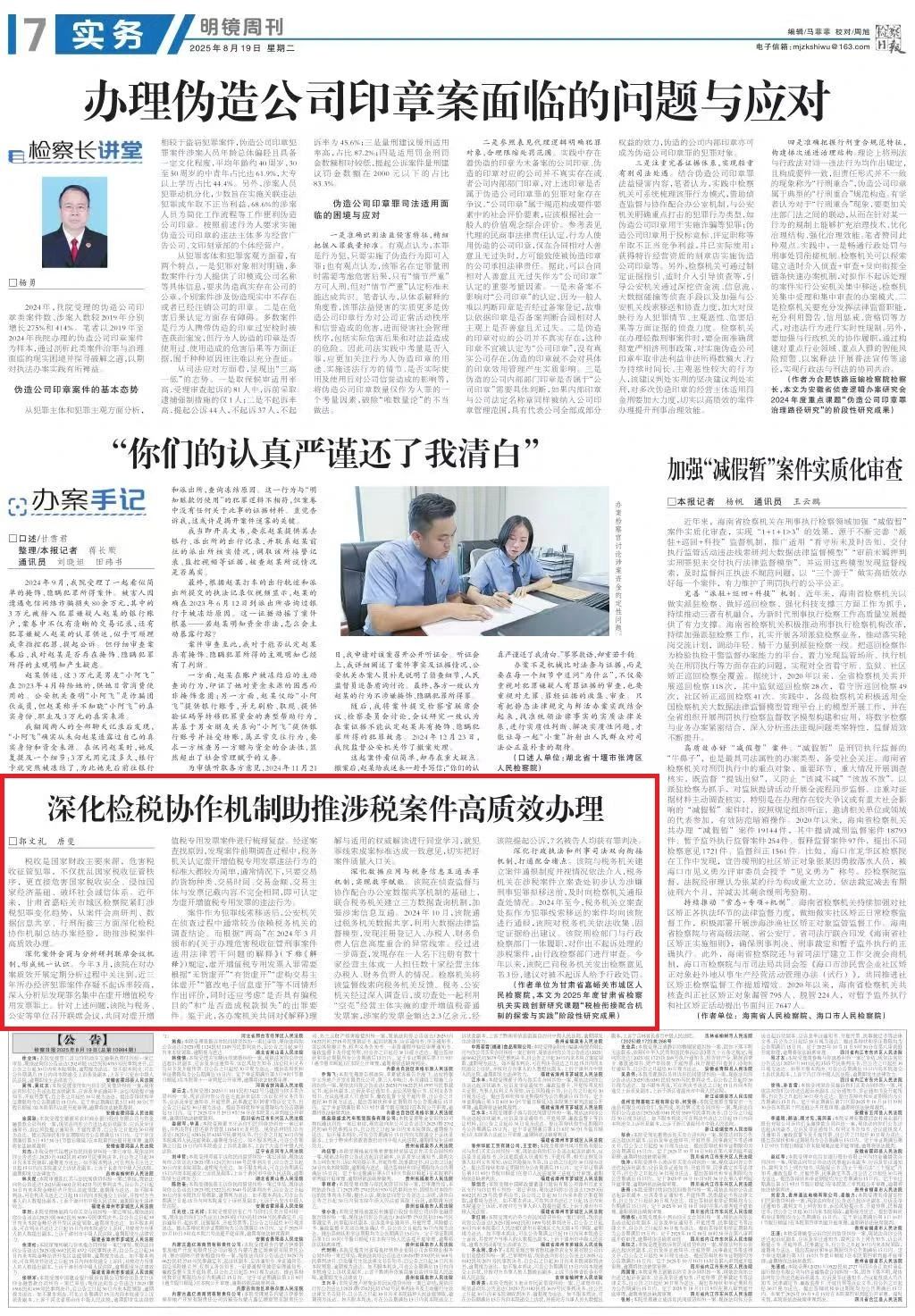 2025年8月19日,检察日报明镜周刊刊发《深化检税协作机制助推涉税案件高质效办理》。