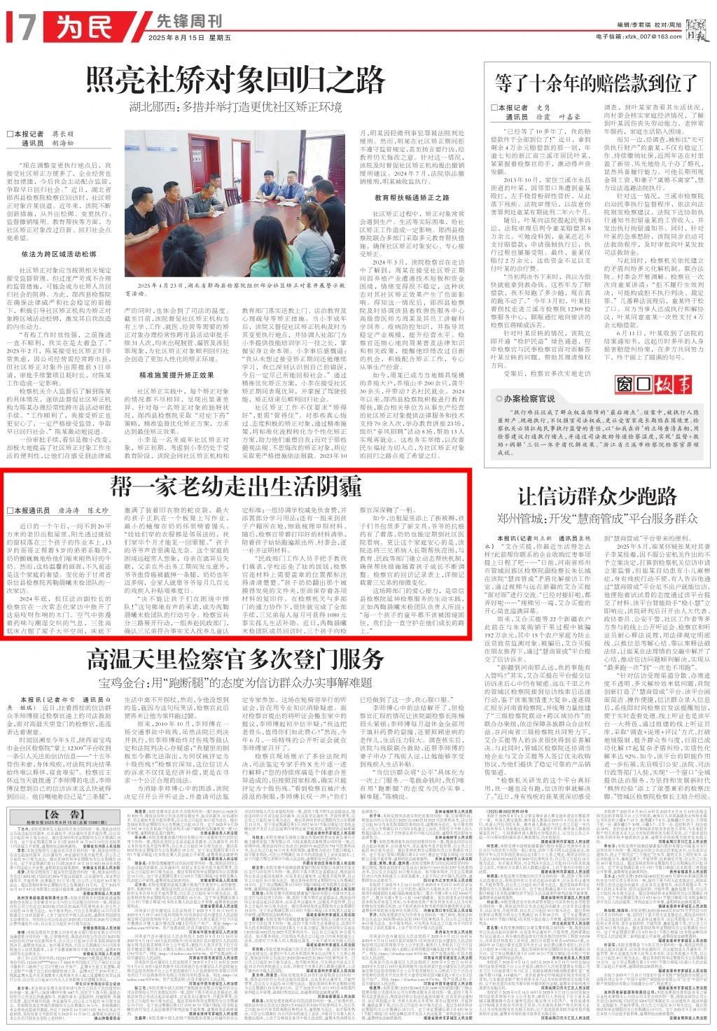 2025年8月15日,检察日报先锋周刊刊发《帮一家老幼走出生活阴霾》。