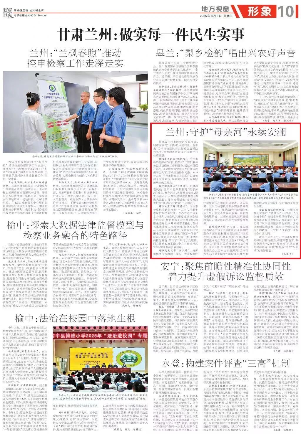 2025年8月8日,检察日报地方视窗《甘肃兰州:做实每一件民生实事》专版刊发《兰州:守护“母亲河”永续安澜》。