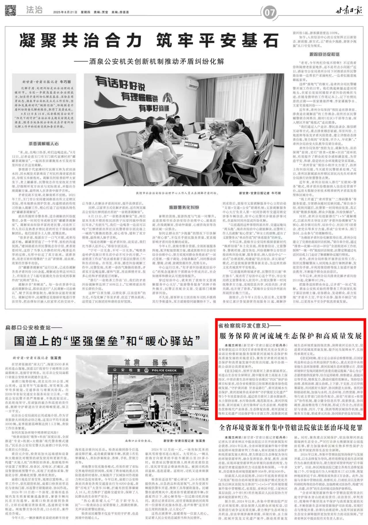 《意见》明确,要立足公益诉讼检察职能,以国家利益和社会公共利益保护为核心,重点关注中央和省级生态环保督察、黄河流域生态环境警示片、资源环境审计发现问题和代表委员建议提案、“益心为公”志愿者提供线索等,综合运用磋商、检察建议、提起诉讼等手段,精准发力,推动问题有效解决。坚持综合治理、系统治理、源头治理,上下游、干支流、左右岸统筹谋划,共同抓好大保护、协同推进大治理。依托府检联动机制,加强与水利、生态环境、自然资源、林草等行政主管部门的协作配合,深化“河湖长+检察长”协作机制,建立健全信息共享、线索移送、协同调查、跟踪整改等工作机制,形成工作合力;用活用好与青海、四川、宁夏、陕西等跨区域协作机制,凝聚各方力量,形成多元共治、协同保护的良好局面。(新甘肃·甘肃日报记者石丹丹)