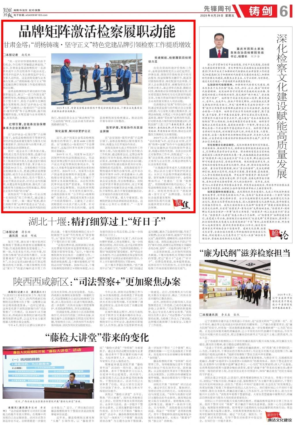 2025年8月29日,检察日报先锋周刊刊发《品牌矩阵激活检察履职动能 甘肃金塔:“胡杨铸魂·坚守正义”特色党建品牌引领检察工作提质增效》。