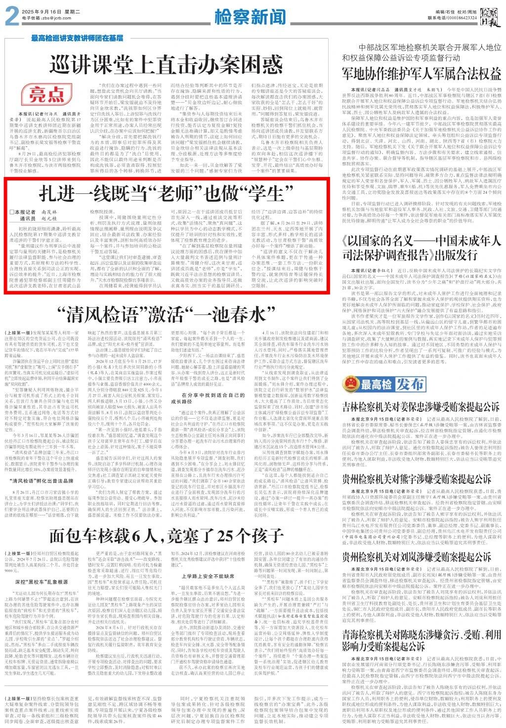 2025年9月16日,检察日报刊发《扎进一线既当“老师”也做“学生”》。