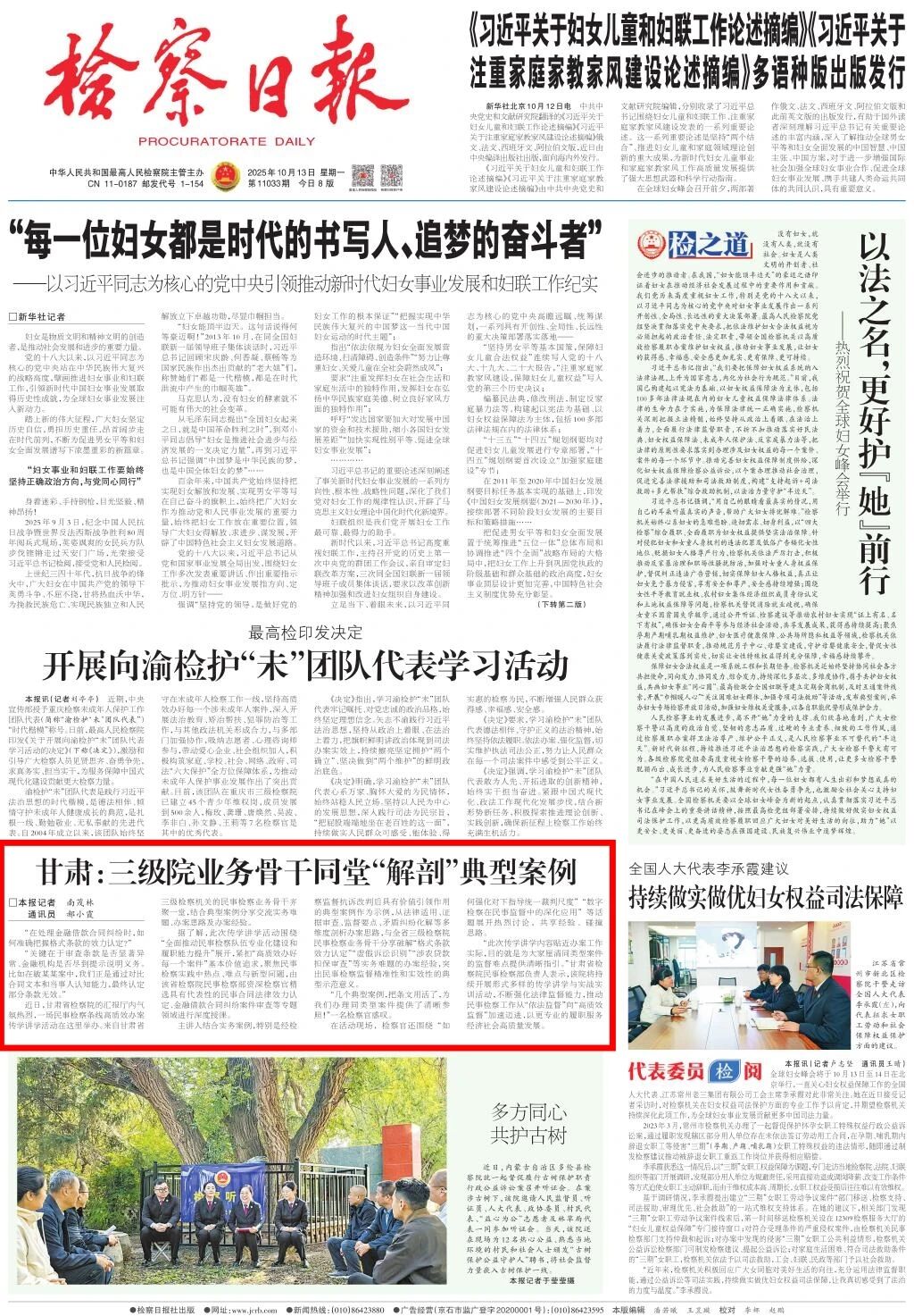 2025年10月13日,检察日报头版刊发《甘肃:三级院业务骨干同堂“解剖”典型案例》。