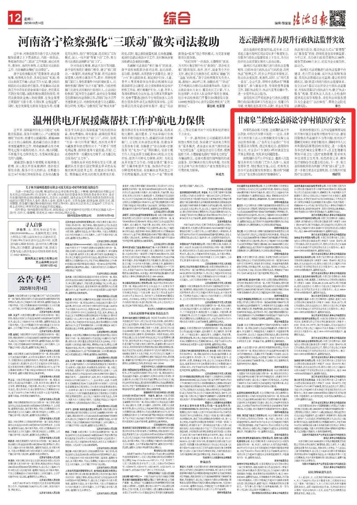 2025年10月14日,法治日报刊发《甘肃皋兰检察公益诉讼守护村镇医疗安全》。