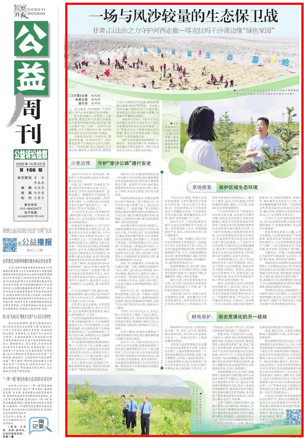 2025年10月22日,检察日报公益周刊刊发《一场与风沙较量的生态保卫战 甘肃:以法治之力守护河西走廊—塔克拉玛干沙漠边缘“绿色家园”》。