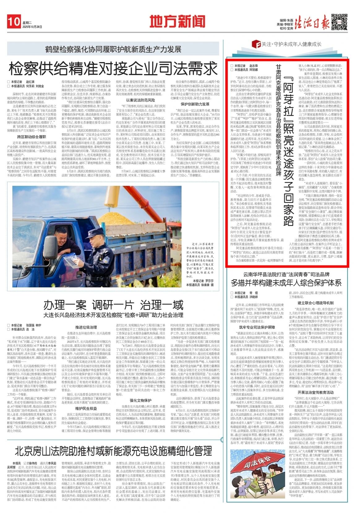 2025年10月28日,法治日报刊发《甘肃阿克塞哈萨克族自治县司机社创建未检品牌 “阿芽拉”照亮迷途孩子回家路》。