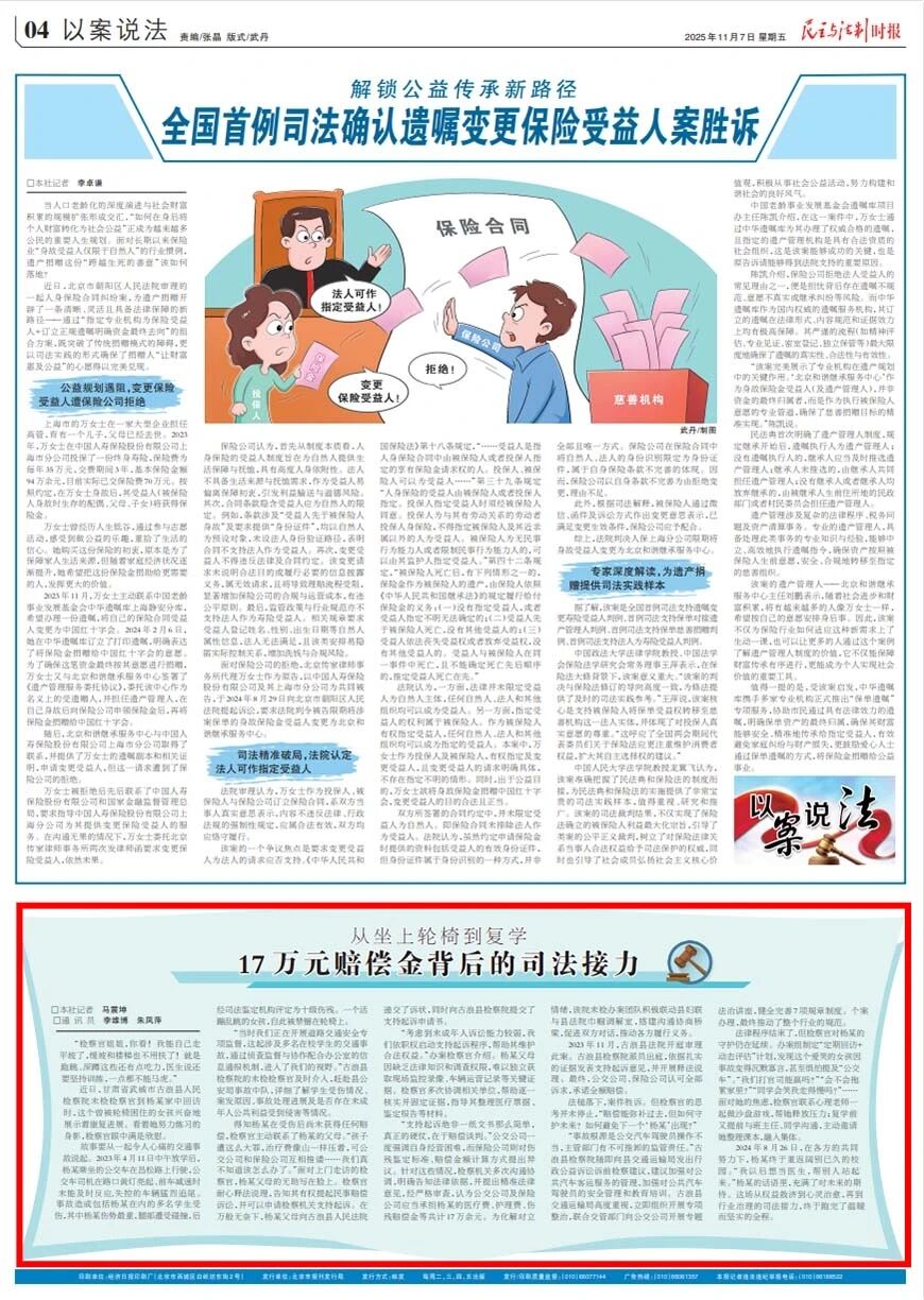 2025年11月7日,民主与法制时报刊发《从坐上轮椅到复学:17万元赔偿金背后的司法接力》。