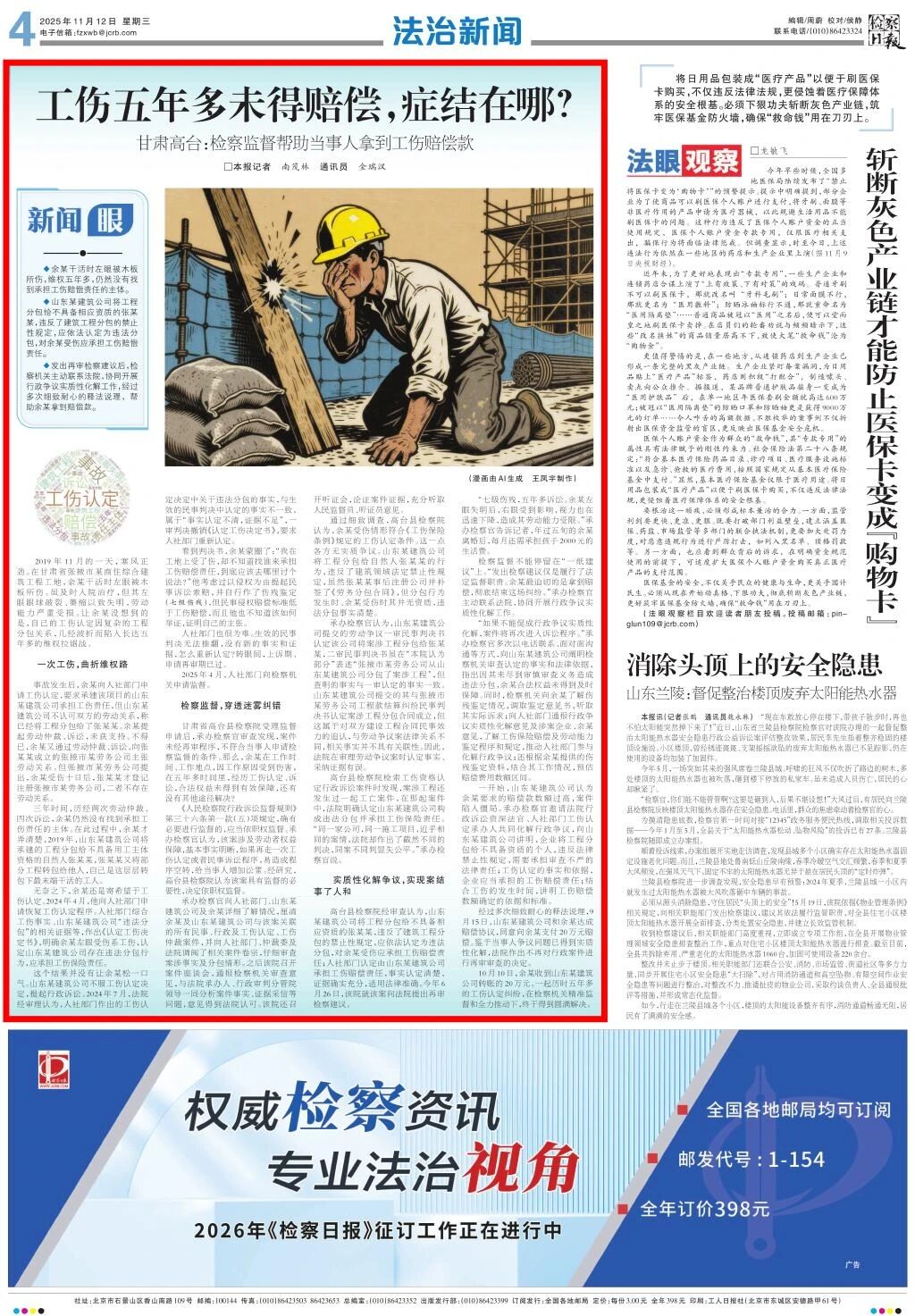 2025年11月12日,检察日报刊发《工伤五年多未得赔偿,症结在哪? 甘肃高台:检察监督帮助当事人拿到工伤赔偿款》。