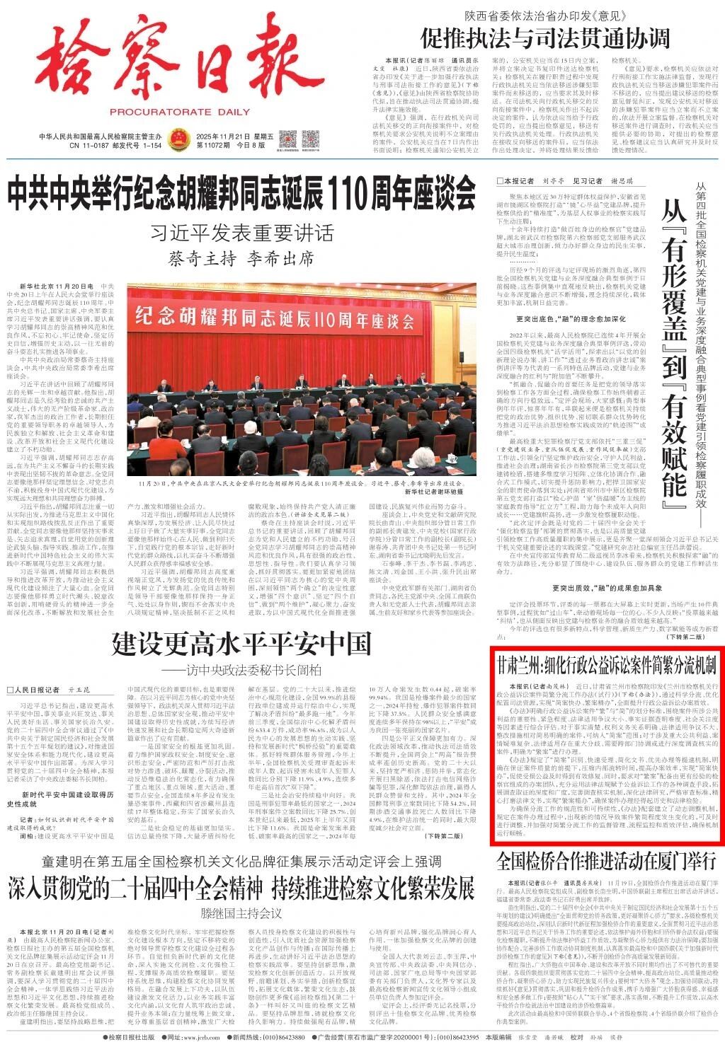 2025年11月21日,检察日报头版刊发《甘肃兰州:细化行政公益诉讼案件简繁分流机制》。