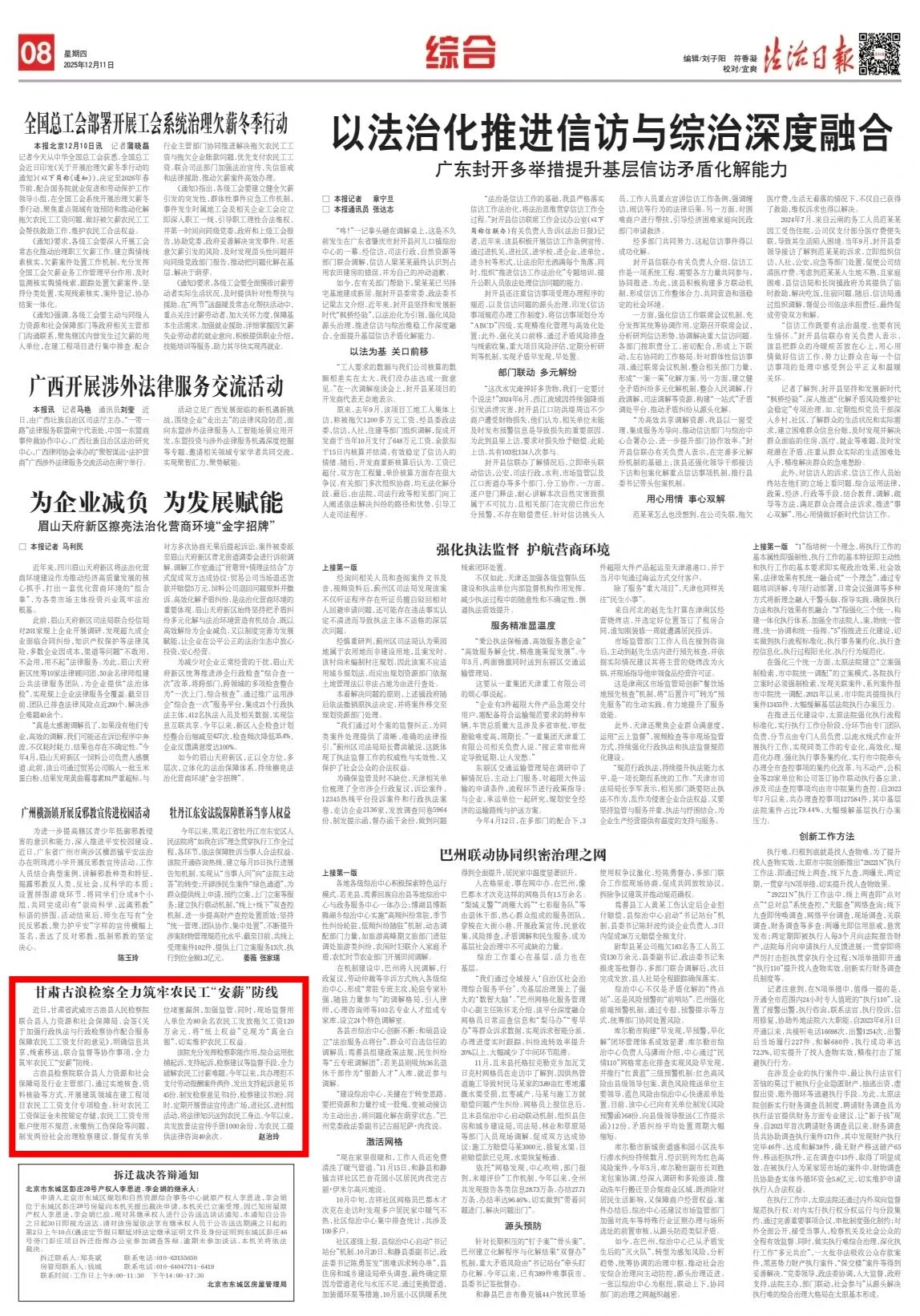 2025年12月11日,法治日报刊发《甘肃古浪检察全力筑牢农民工“安薪”防线》。
