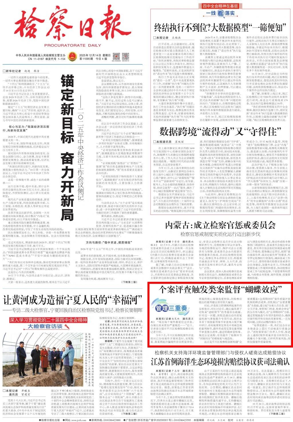 2025年12月14日,检察日报头版刊发《个案评查触发类案监督“蝴蝶效应”》。