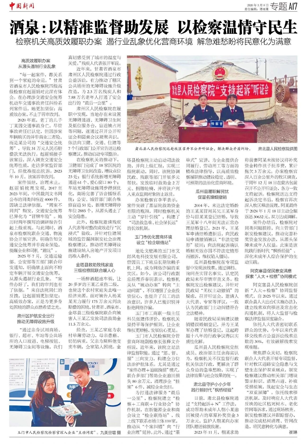 2026年3月8日,中国新闻刊发《酒泉:以精准监督助发展 以检察温情守民生 检察机关高质效履职办案 遏行业乱象优化营商环境 解急难愁盼将民意化为满意》。