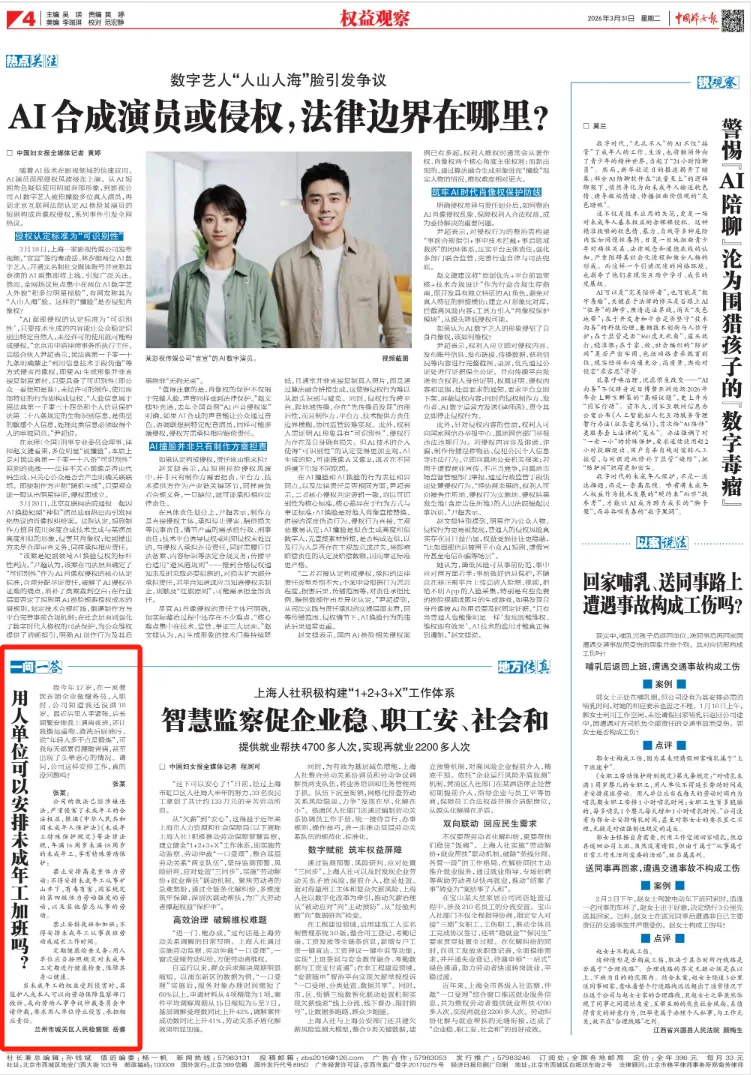 2026年3月31日,中国妇女报刊发《用人单位可以安排未成年工加班吗?》。