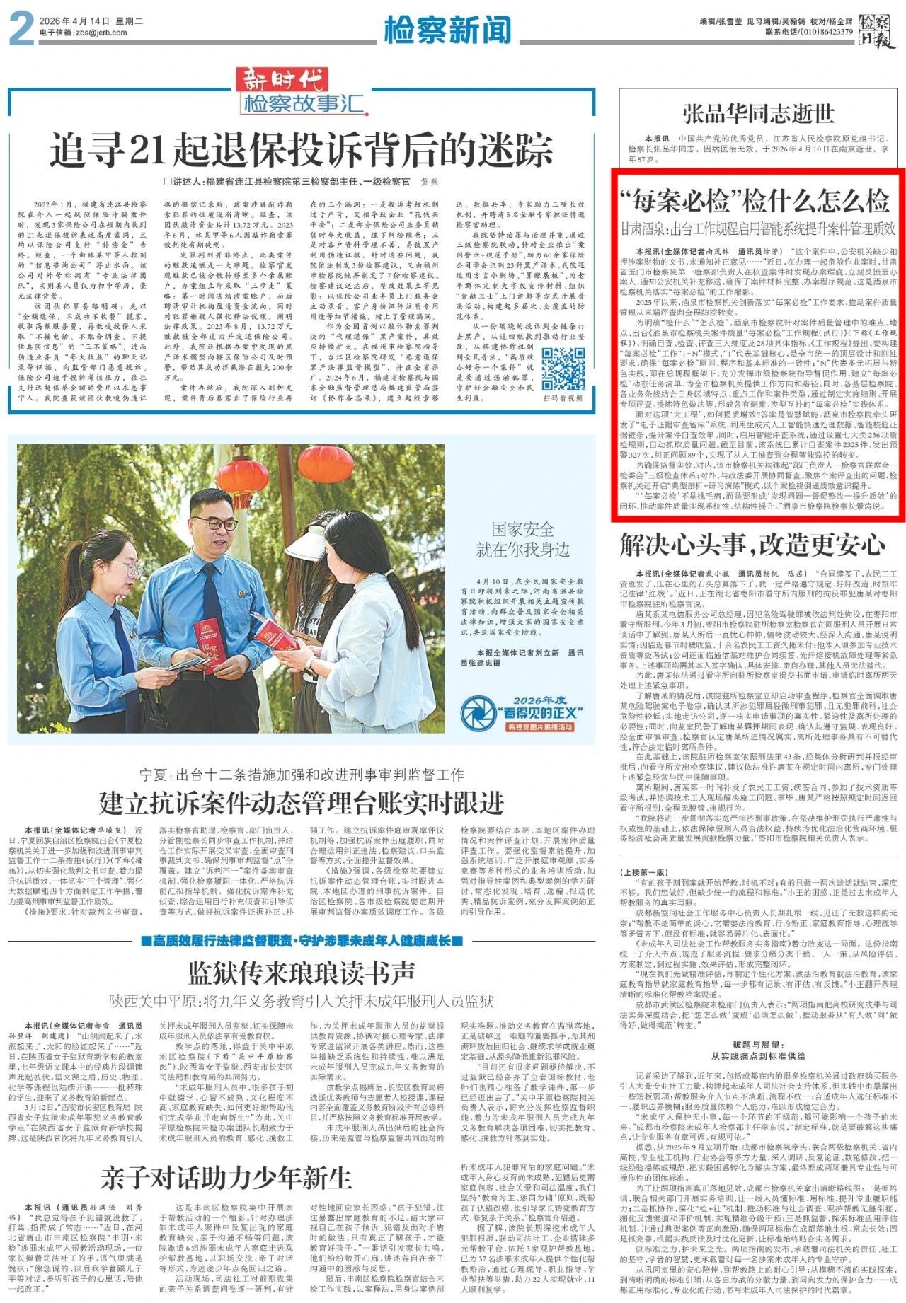 2026年4月14日,检察日报刊发《“每案必检”检什么怎么检 甘肃酒泉出台工作规程启用智能系统提升案件管理质效》。