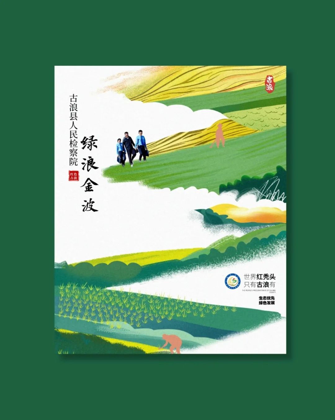 “浪”即是“古浪”的“浪”,又意麦收季节古浪大地被层层包裹的麦“浪”,“绿浪”意为微风吹过,古浪田野里绿油油的红秃头麦苗随风翻起的层层绿浪,与检察干警身上的“检察蓝”相映成辉,处处孕育着的希望色彩,更是涵盖了人与自然的关系,和人们对生态保护和美好生活的追求。“金波”即夏收时节,一望无际的麦田里,微风吹起金波翻滚,沉甸甸的麦穗压弯了麦秆,正所谓“麦田金波起,丰收正忙时”,土地上处处闪耀着红秃头小麦金色的光芒,承载着古浪县人世代相传的农耕智慧与生活哲学,更是古浪大地上一颗璀璨的绿色明珠。“绿浪金波”寓意检察机关将公益诉讼检察融入农业发展保护大局,积极服务乡村振兴战略实施,坚持以品牌农业为牵引,紧盯红秃头小麦等地理标志特色农产品开发保护,坚持强龙头、补链条、聚集群,加快服务构建现代农业产业体系,助力古浪红秃头小麦这一独具地域特色的璀璨瑰宝,成为古浪县特色农业发展的支柱产业。